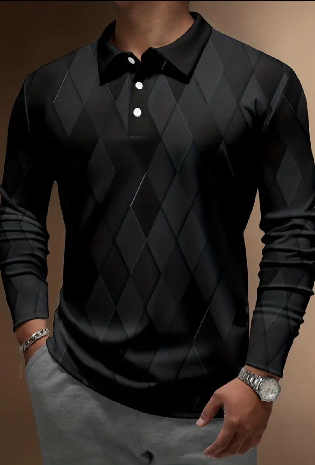 The sleek black hue provides a timeless and polished aesthetic, allowing the shirt to seamlessly transition from casual to slightly more formal settings. The polo collar, a hallmark of this shirt style, adds a sporty yet tailored element, while the long sleeves enhance its adaptability for cooler weather.