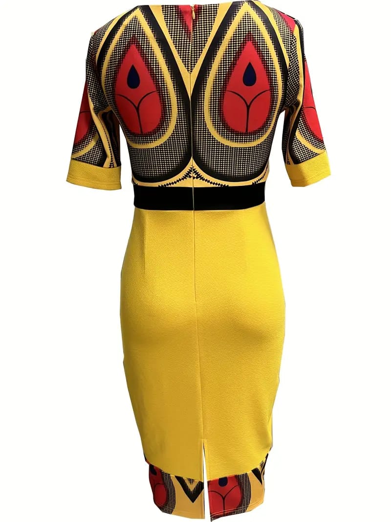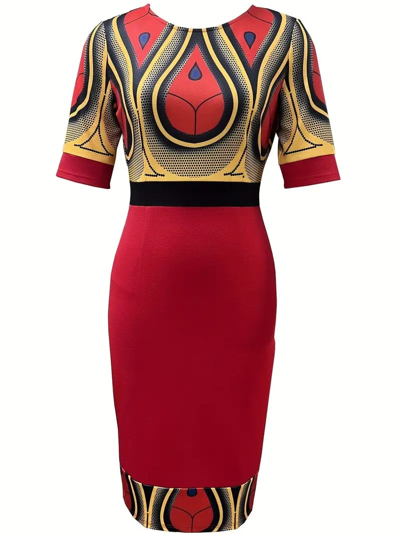 Our patterned upper with a plain down midi dress creates a stylish and dynamic ensemble that balances flair with subtlety. This dress features a thoughtful design, dividing the garment into two distinct sections – the upper part adorned with eye-catching patterns and the lower part kept elegantly plain.